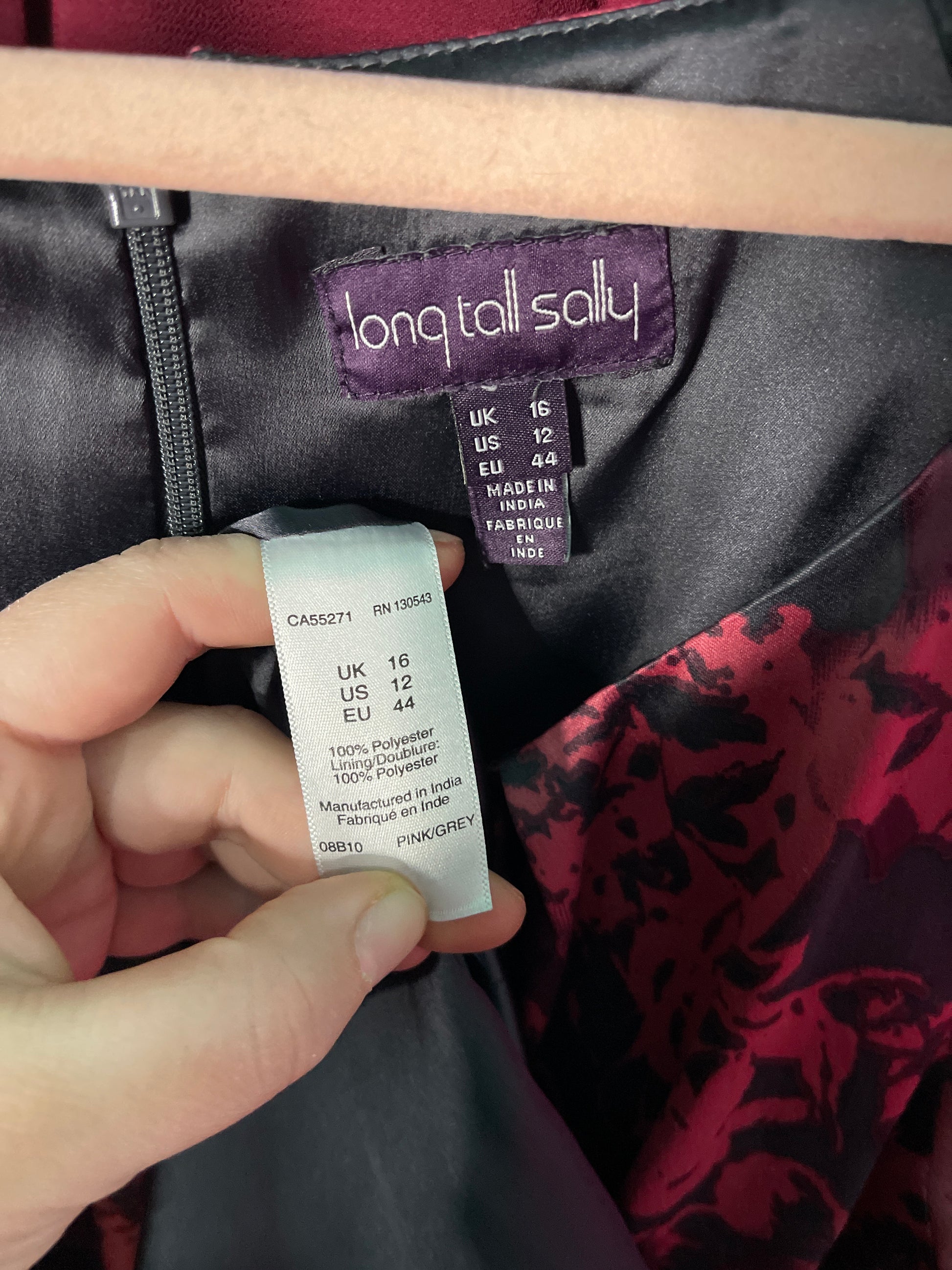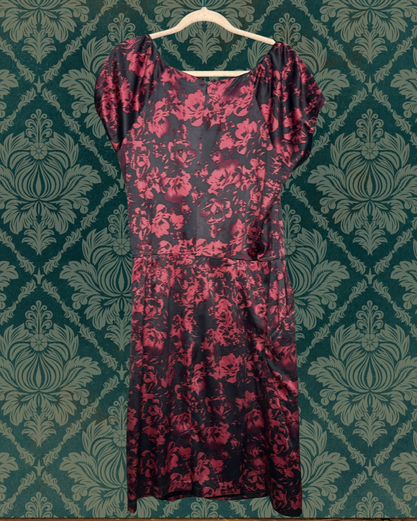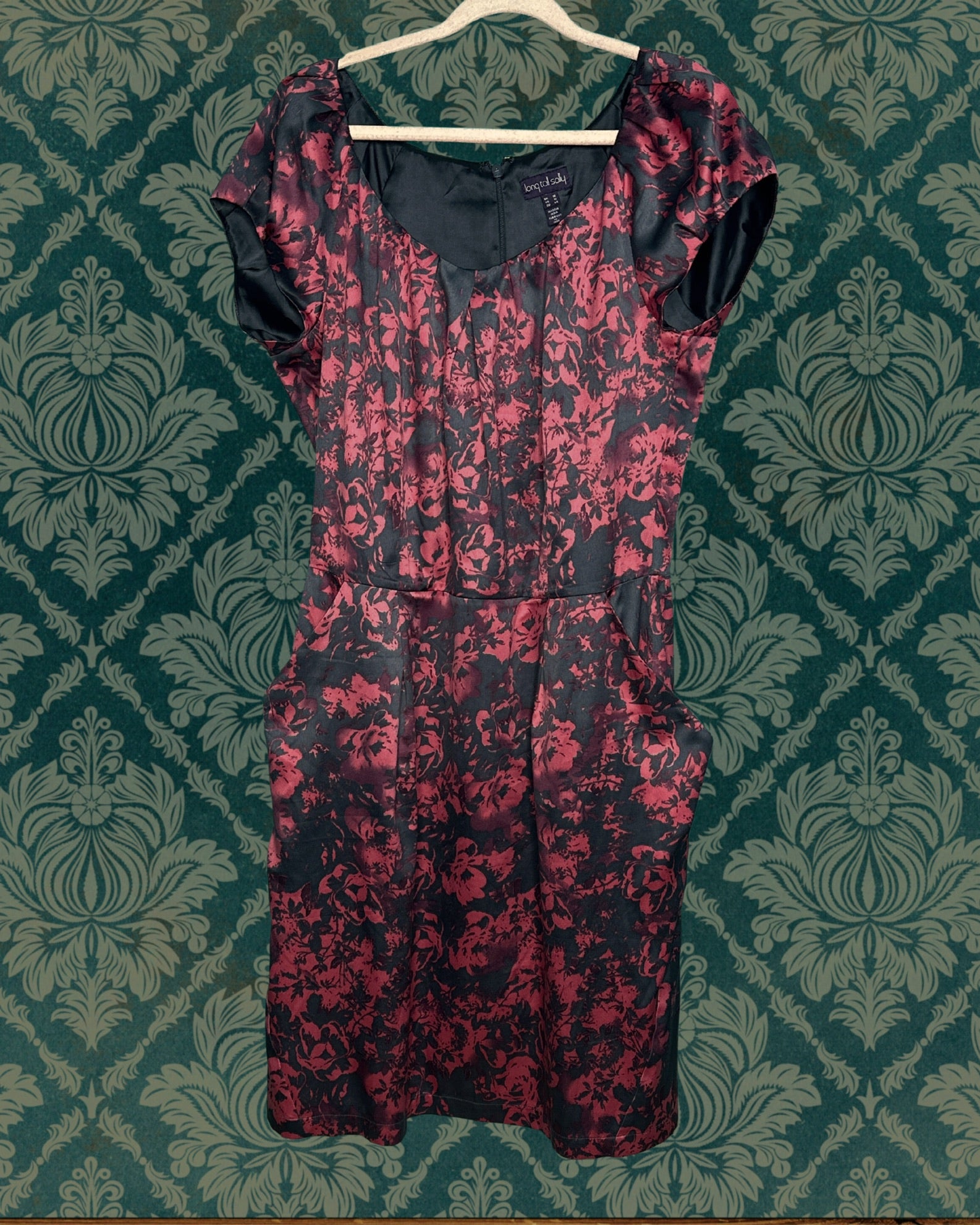 Burgundy & Black Floral Cap Sleeved Satin Dress w/ Pockets