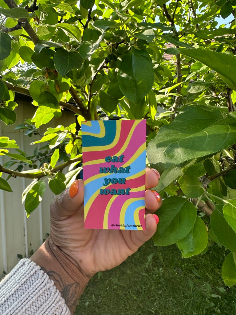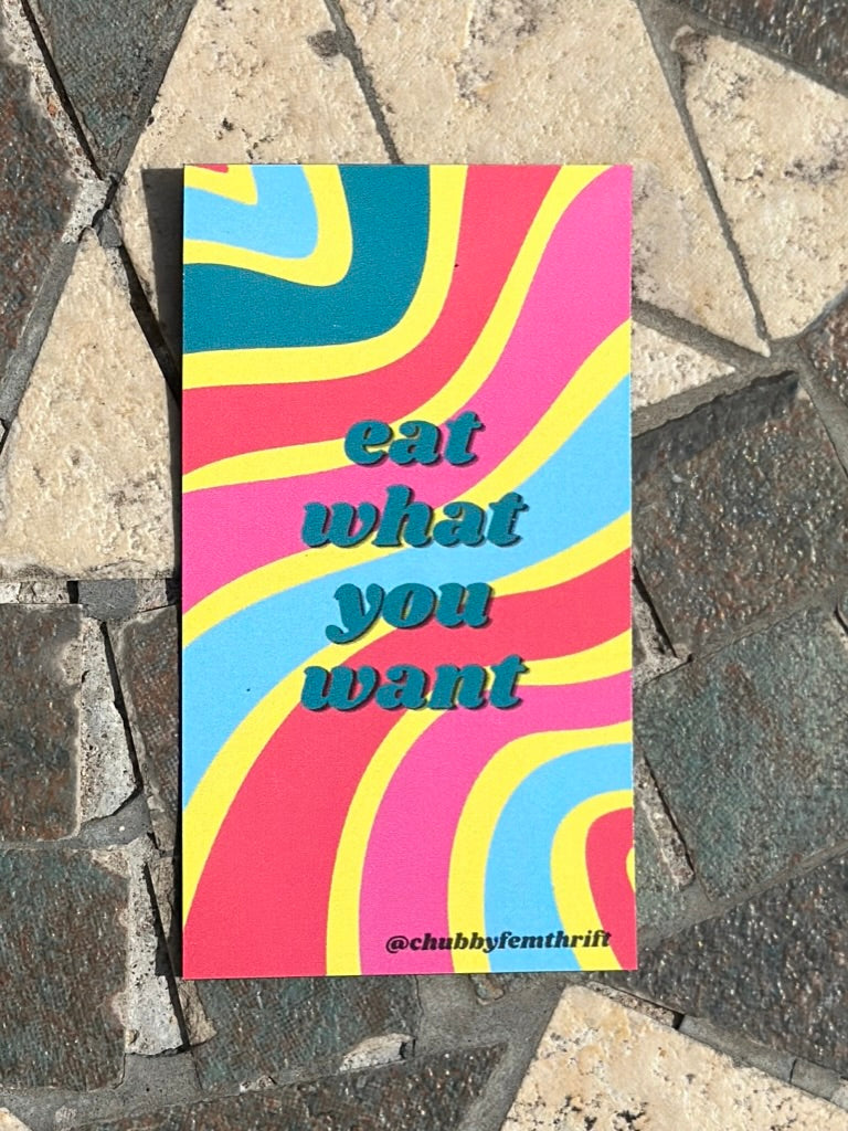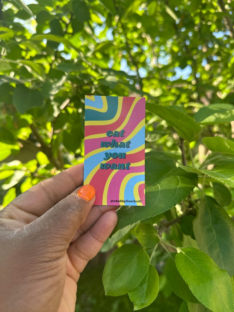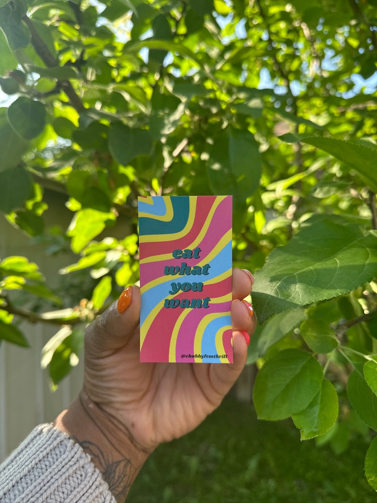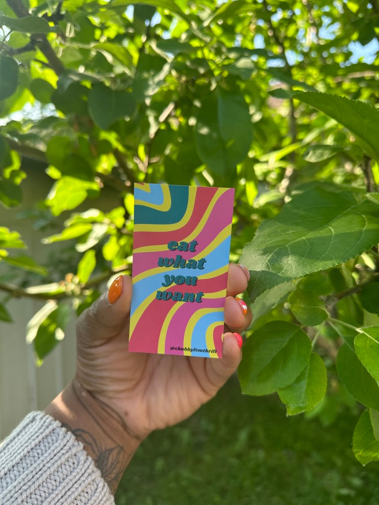 I love having this groovy reminder magnet on my fridge. Having spent many years trapped in diet cycling, sometimes those old habits can slip back in. This reminds me that that isn't who I am anymore, and food isn't the enemy.