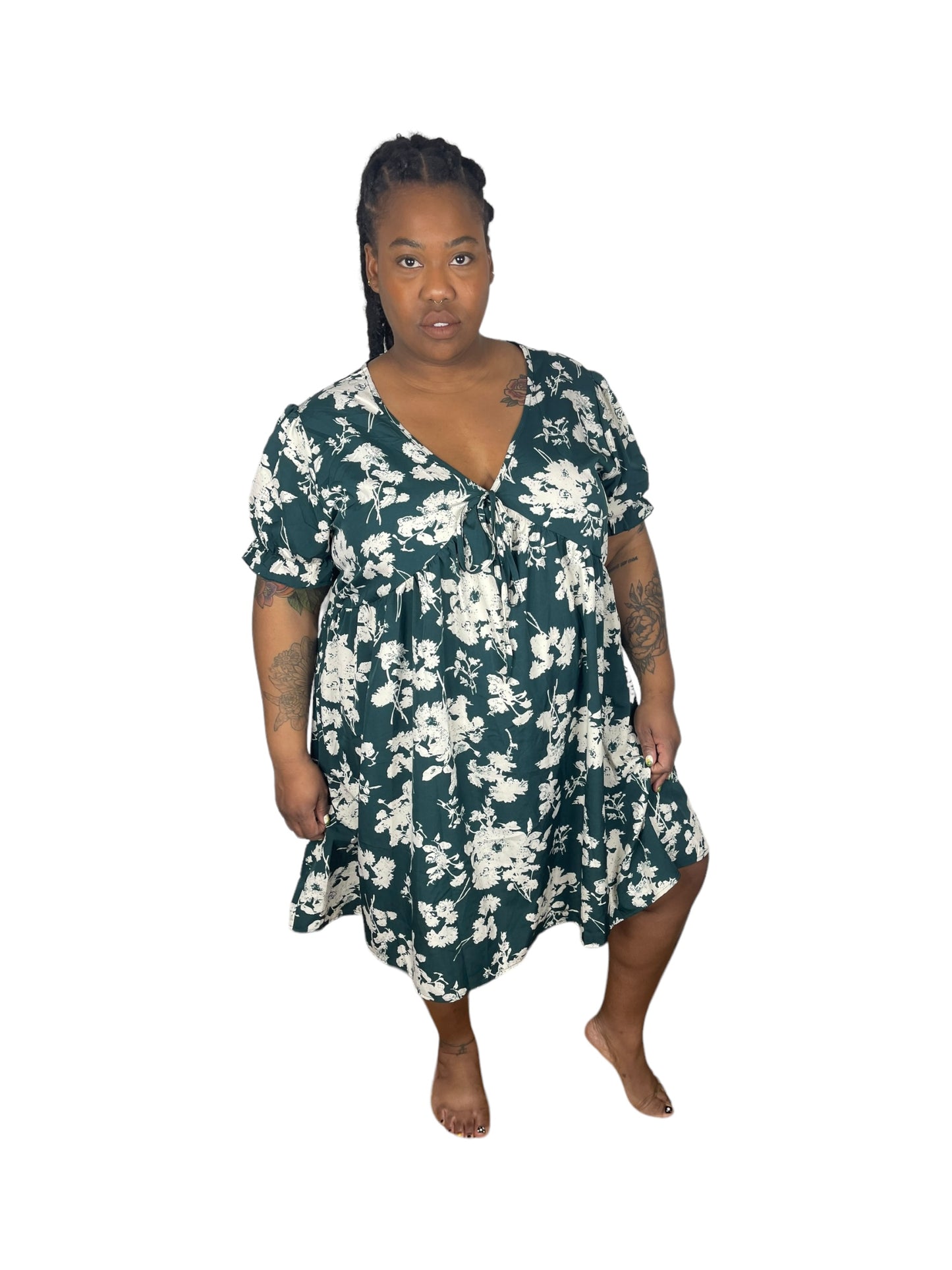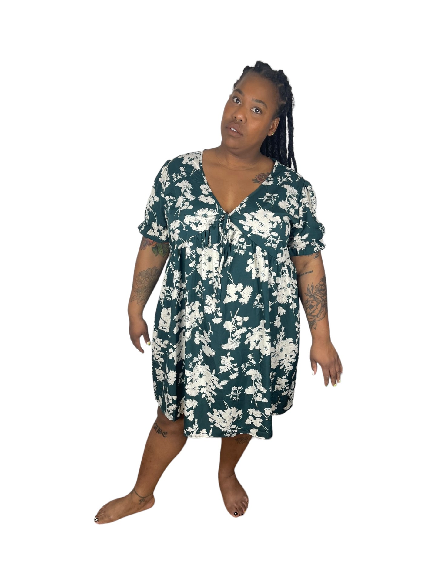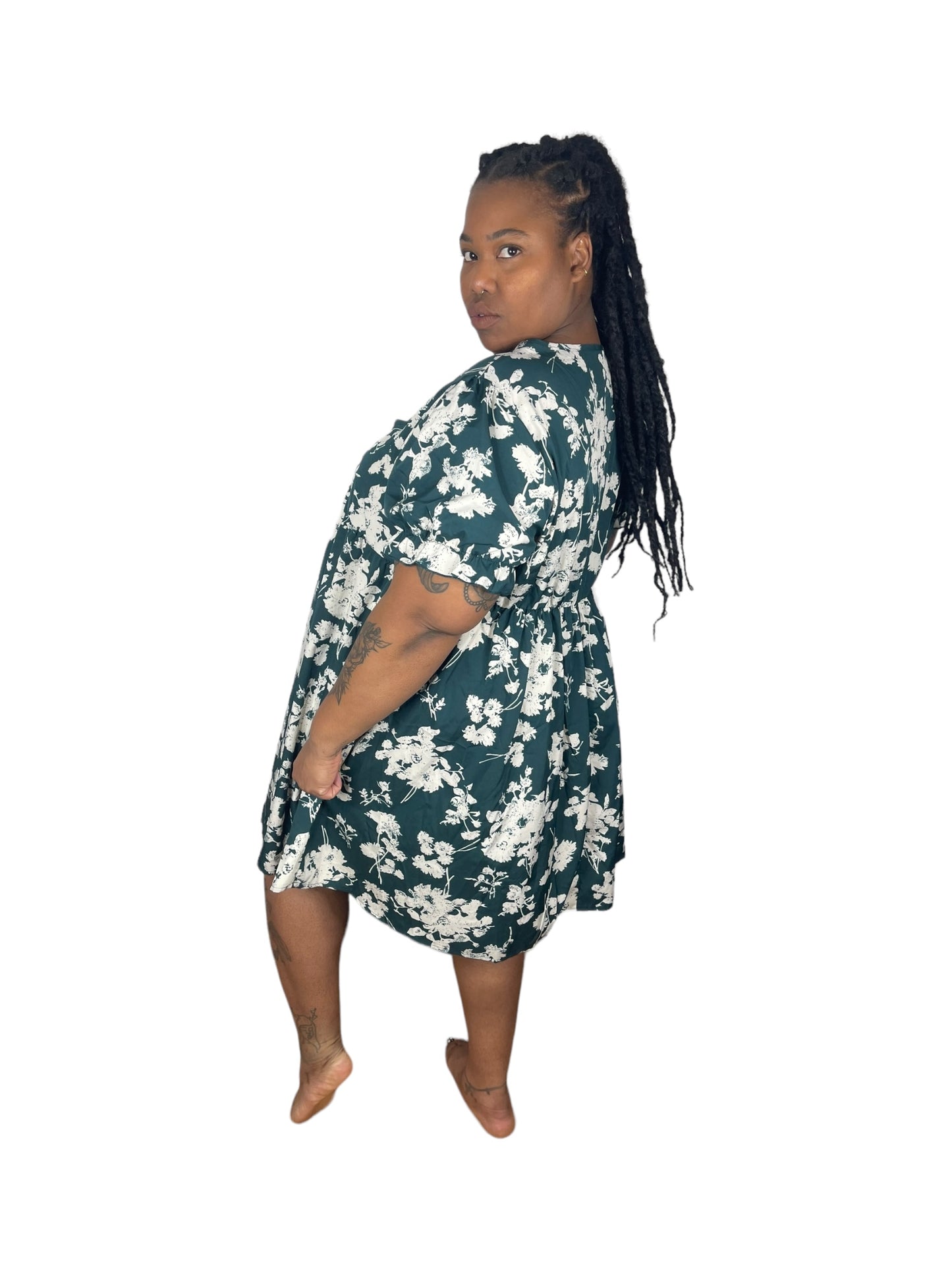 Green w/ White Floral Deep V Puff Short-Sleeve Dress (4XL)