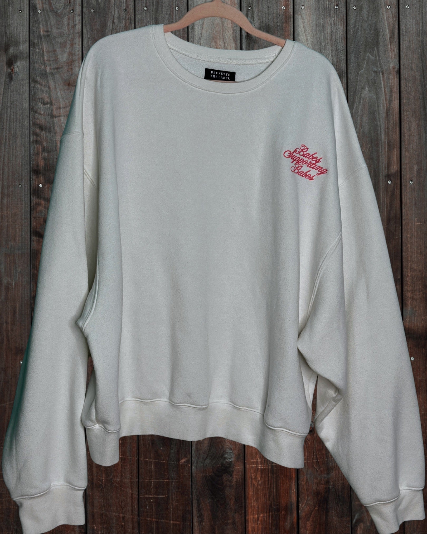White with Pink "Babes Supporting Babes" Embroidery Crewneck Sweater
