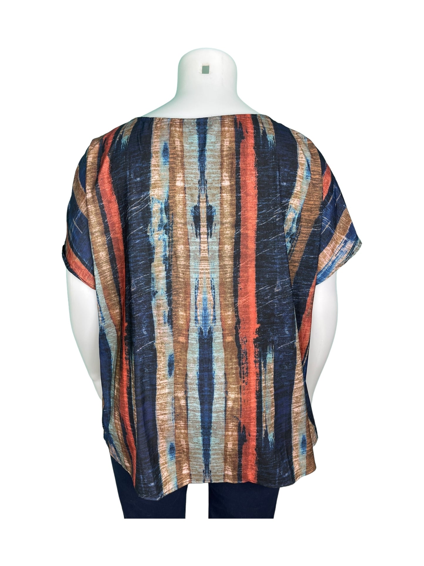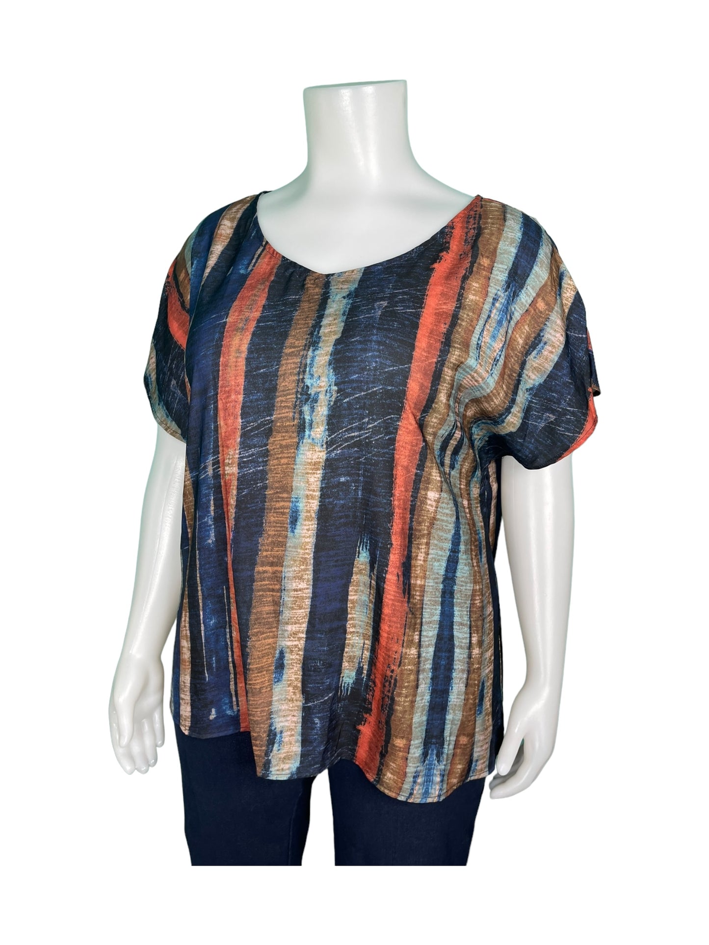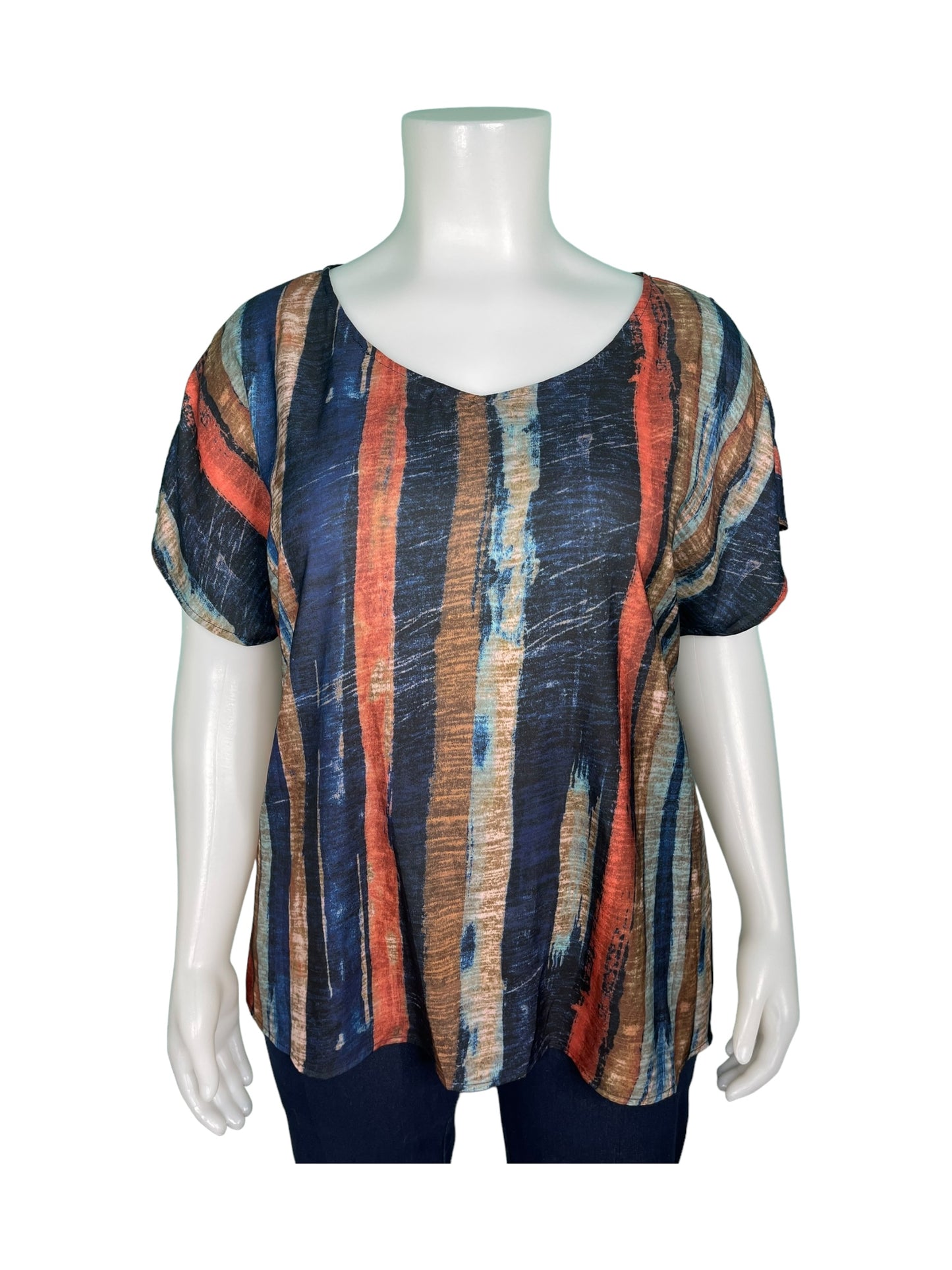Blue, Orange, Brown Striped Abstract Print Short Sleeve Top