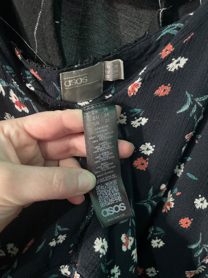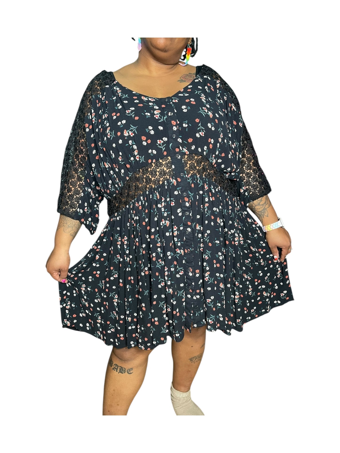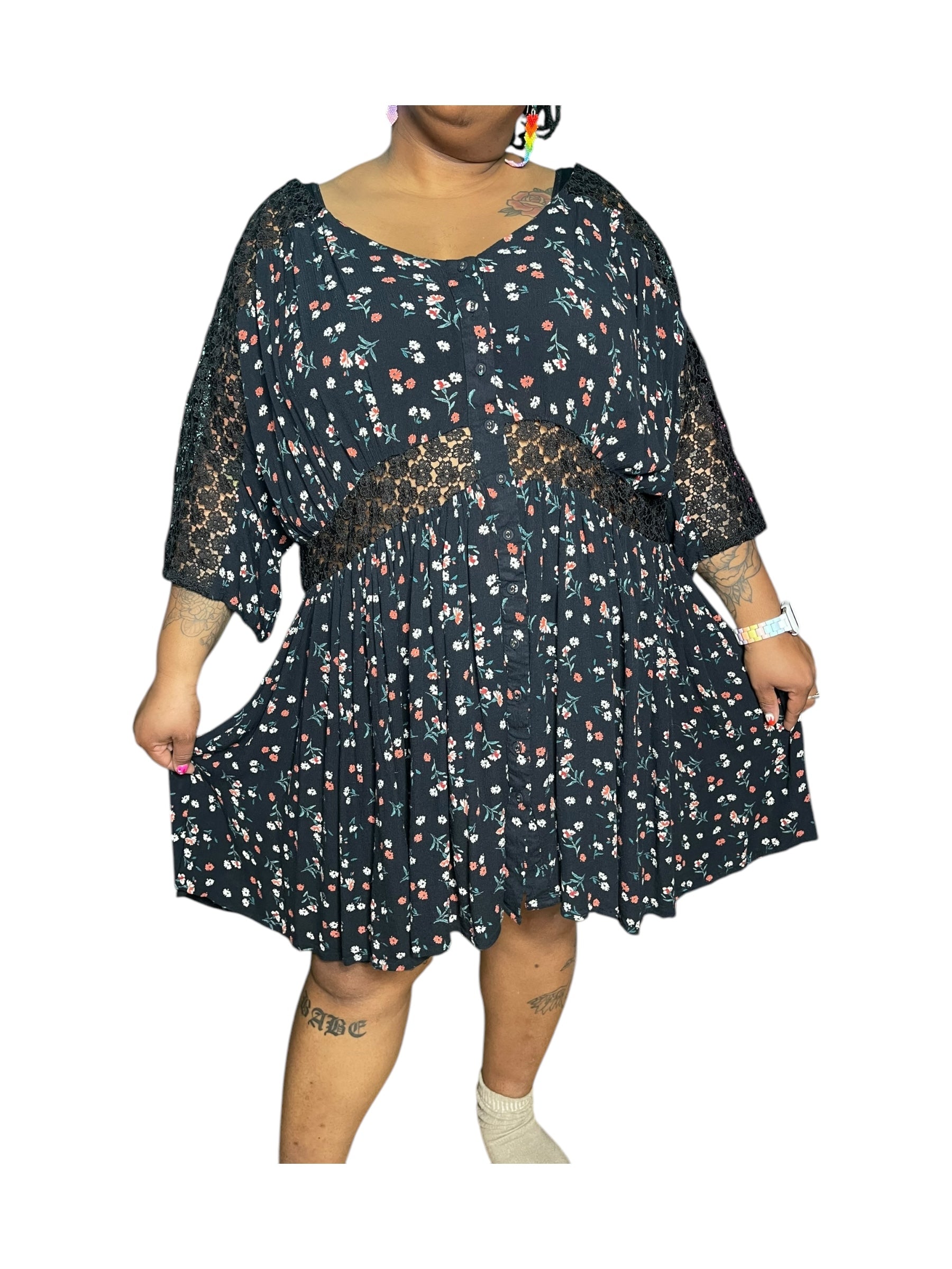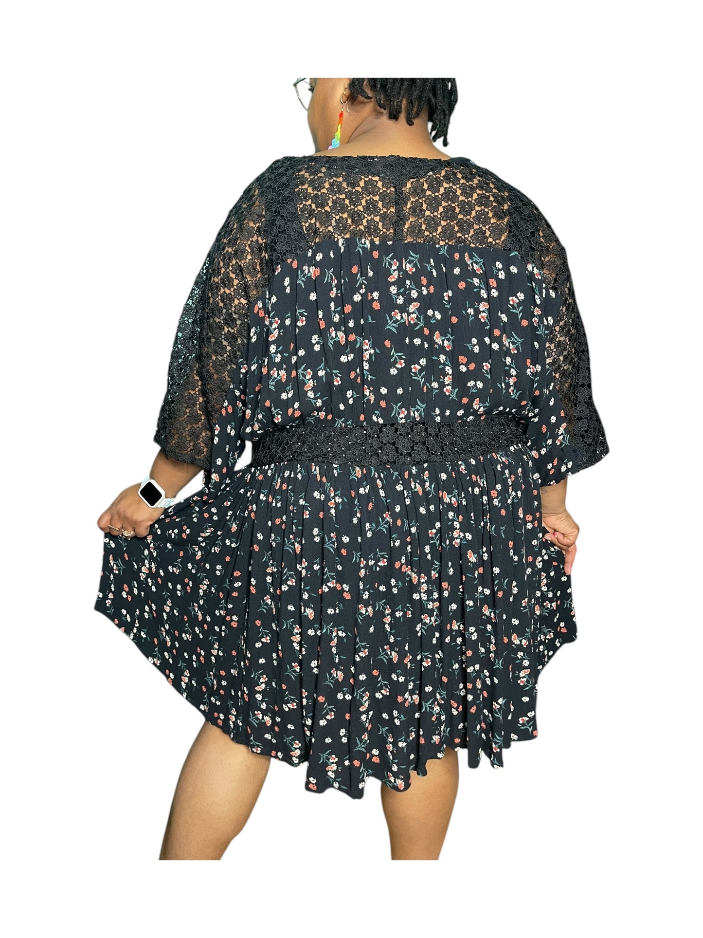 Navy Blue w/ Coral and Beige Floral Lace Panel Dress